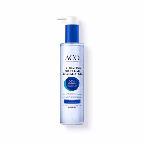ACO Hydrating Micellar Cleanser Gel fjerner sminke skånsomt og gir intensiv fukt. Med hyaluronsyre, pantenol og prebiotika. Vegansk og parfymefri.