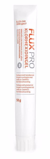 Flux Pro Klorhexidin Gel (0,12 %) med fluor behandler plakk og tannkjøttproblemer effektivt. Uten alkohol og SLS. Perfekt etter tanntrekking