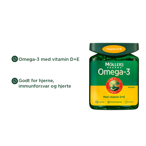 Möller's Pharma Omega-3 kapsler for barn over 3 år og voksne. Med D-vitamin for immunforsvaret og omega-3 for hjerte og hjerne.