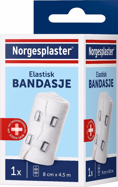 Norgesplaster Elastisk bandasje (8 cm x 4,5 m) gir god støtte ved forstuing og forstrekking. Pustende, lateksfri og vaskbar. Med 2 festehemper.