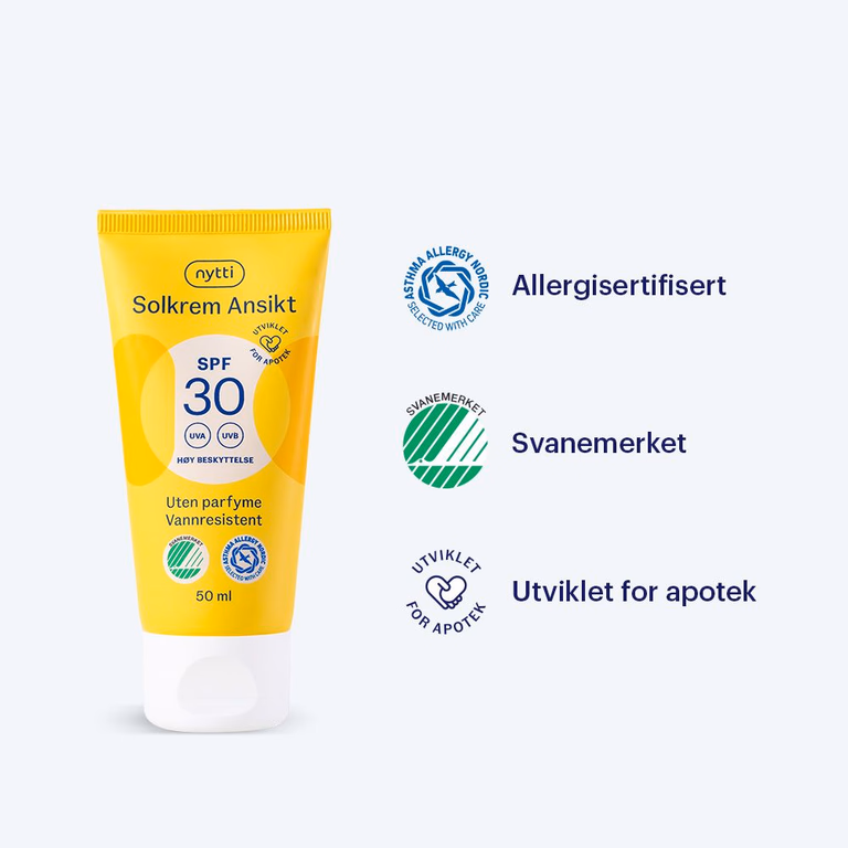 Nytti Ansiktssolkrem SPF30 er en fuktighetsgivende og Svanemerket solkrem uten parfyme. Trekker raskt inn uten å fette. Perfekt for sensitiv hud.