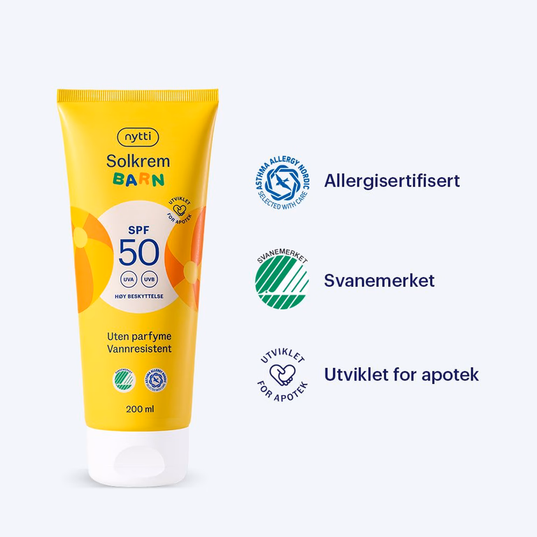 Nytti Solkrem for Barn SPF50 gir maksimal beskyttelse til sensitive småbarn. Svanemerket, allergisertifisert og uten parfyme. Trekker raskt inn.